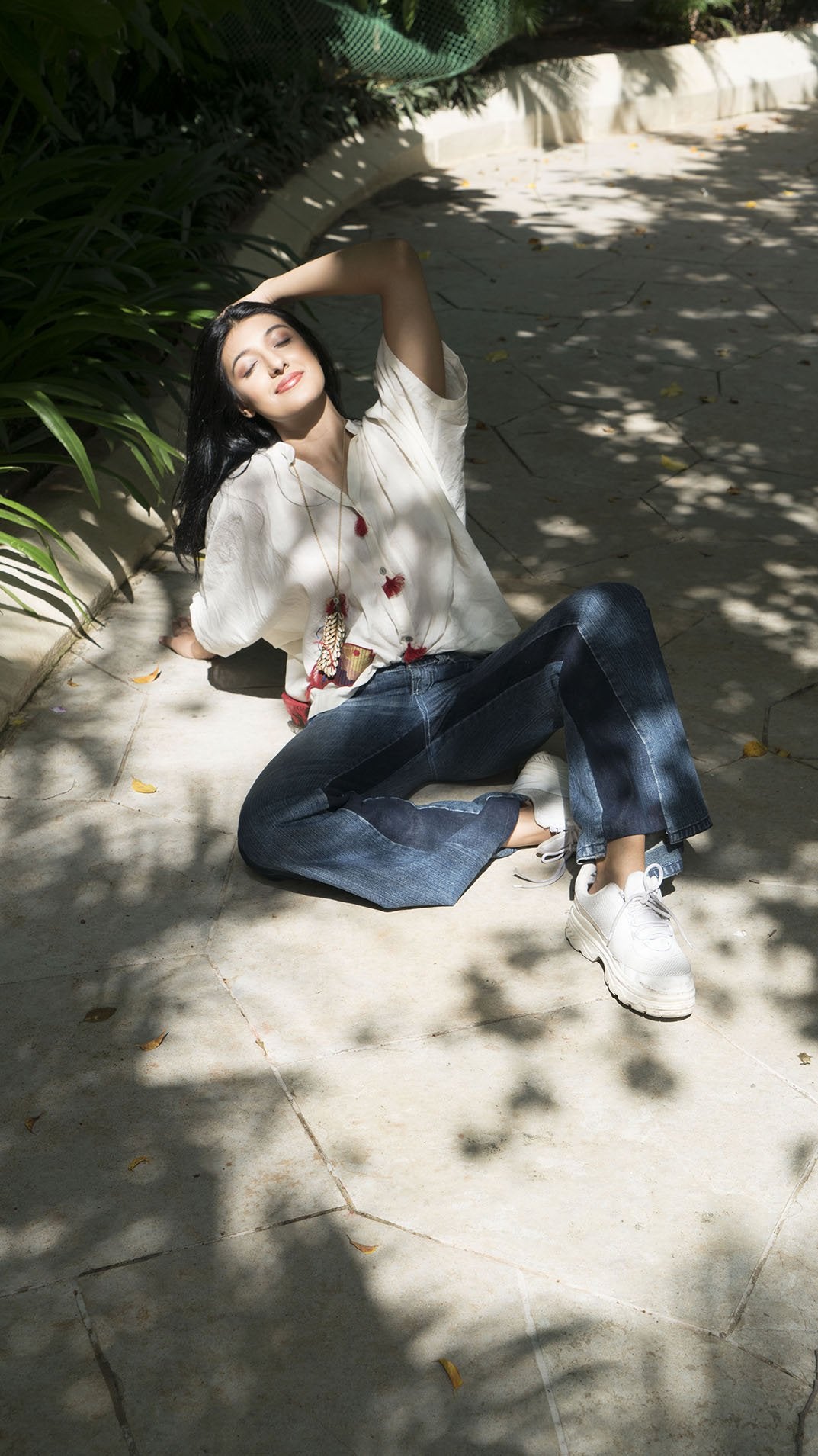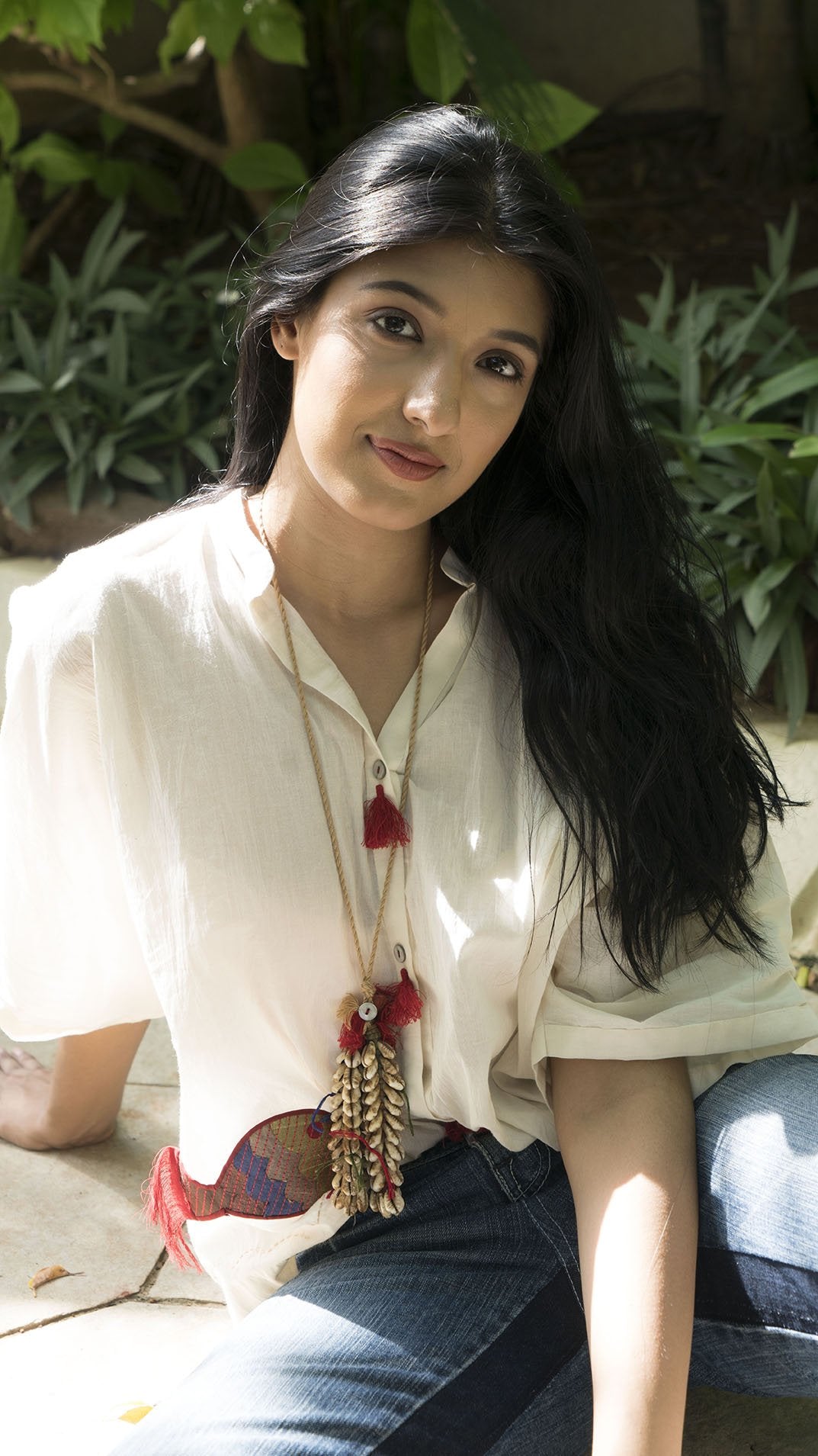 Off white cotton voile boxy shirt with fish patch work on the front