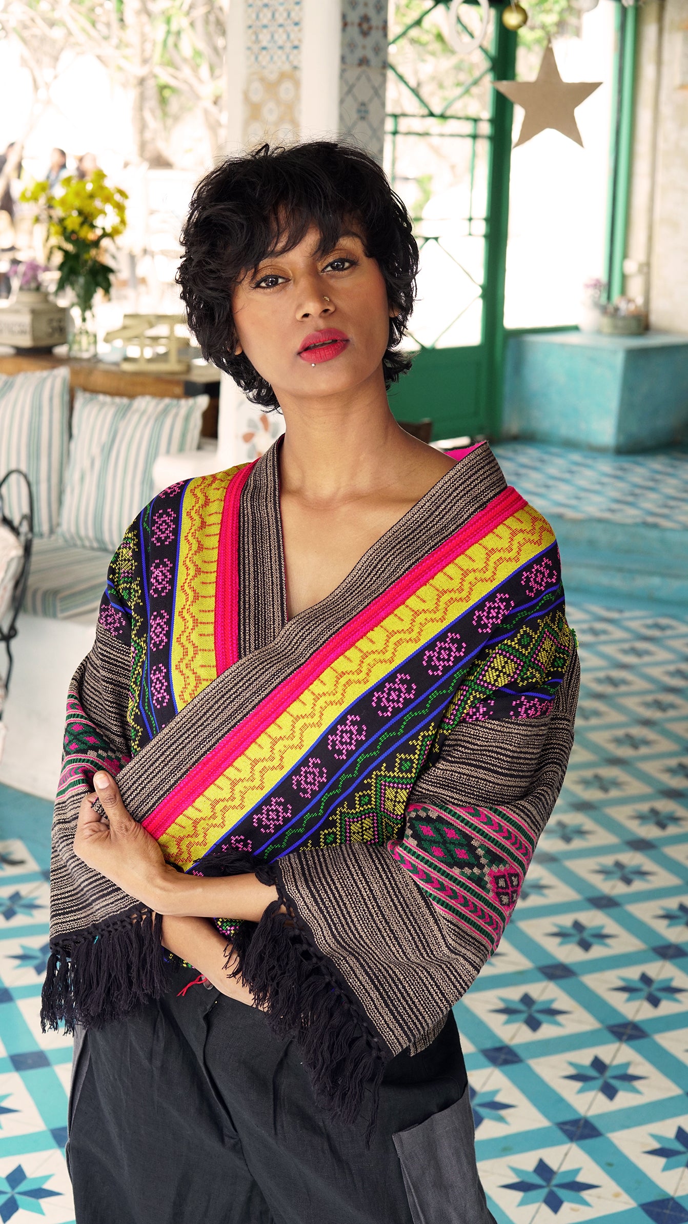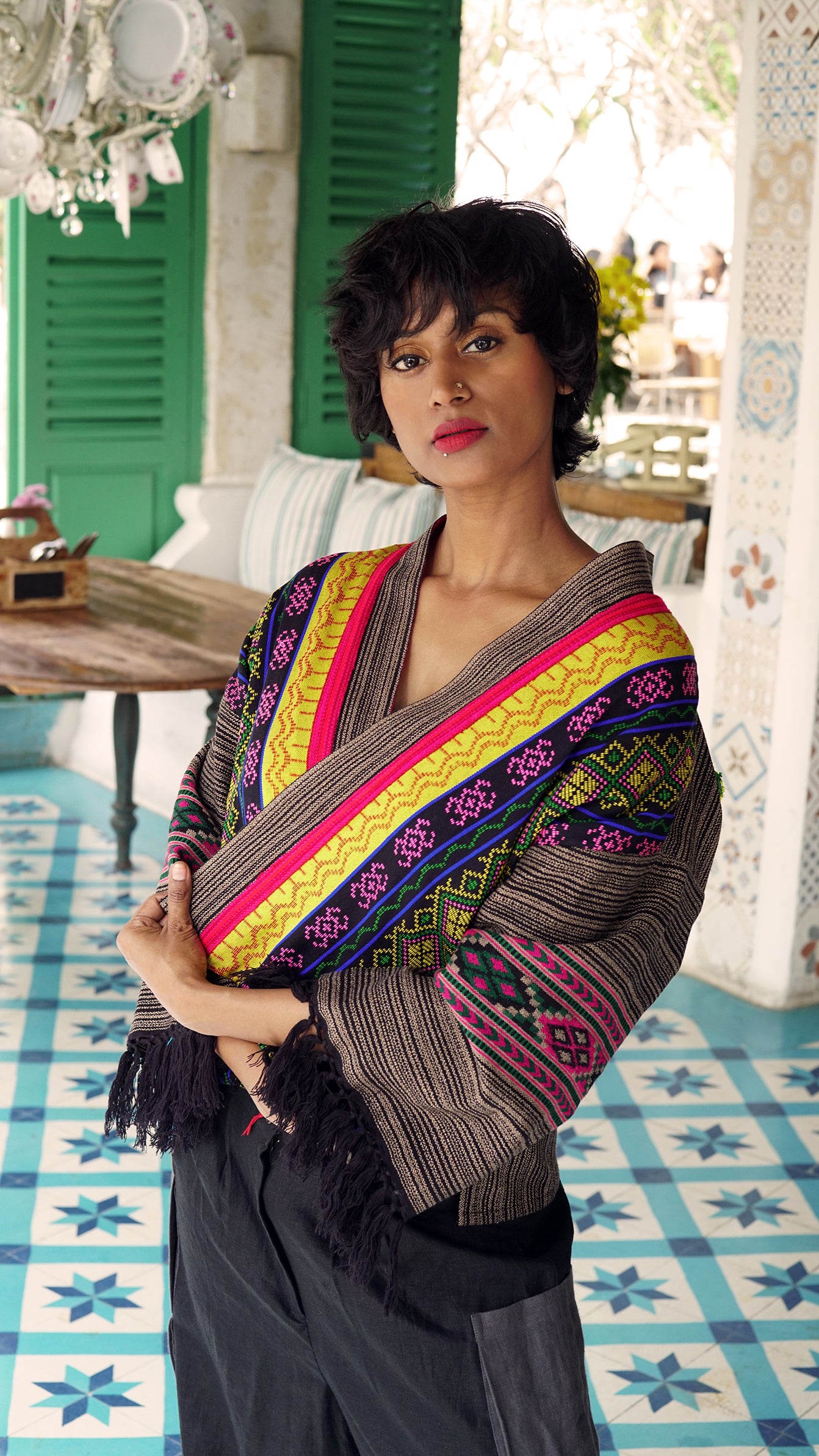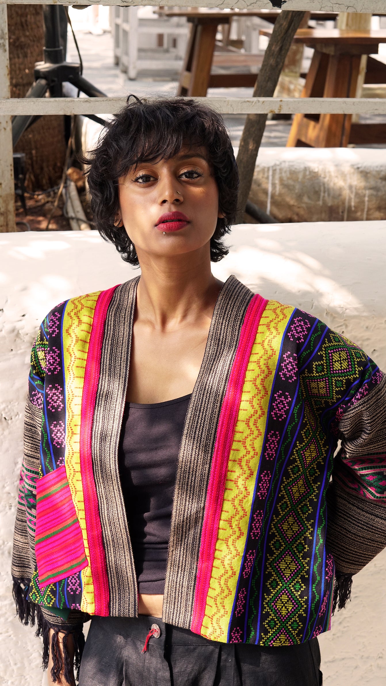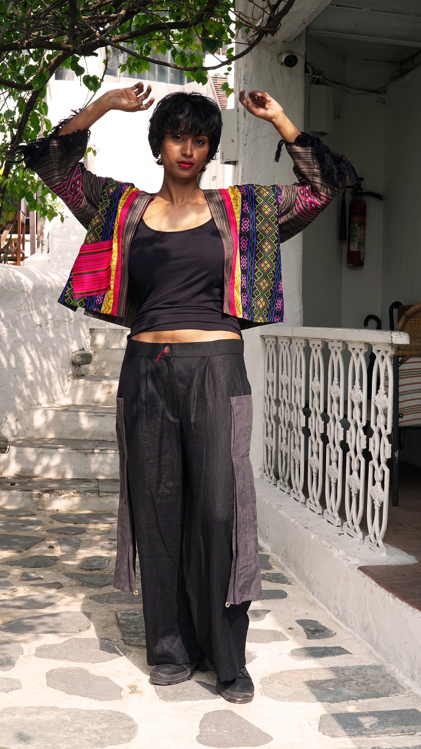 Perfect for layering, Black and Brown short Jacket is crafted from Black-hued fabric from Afghanistan . This jacket features a relaxed fit complemented by a Woven collar, trims and exaggerated fringes at the sleeves. For a stylish travel look accessorise it with Handbags and neck Pieces from Asmita Marwa.