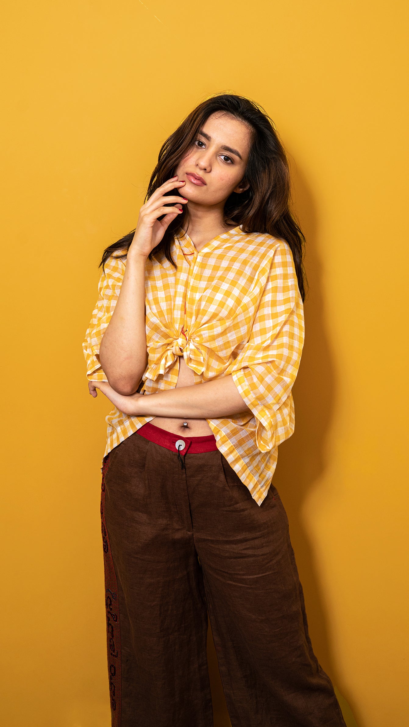 Product Type -Yellow checks Aham Script Boxy Shirt