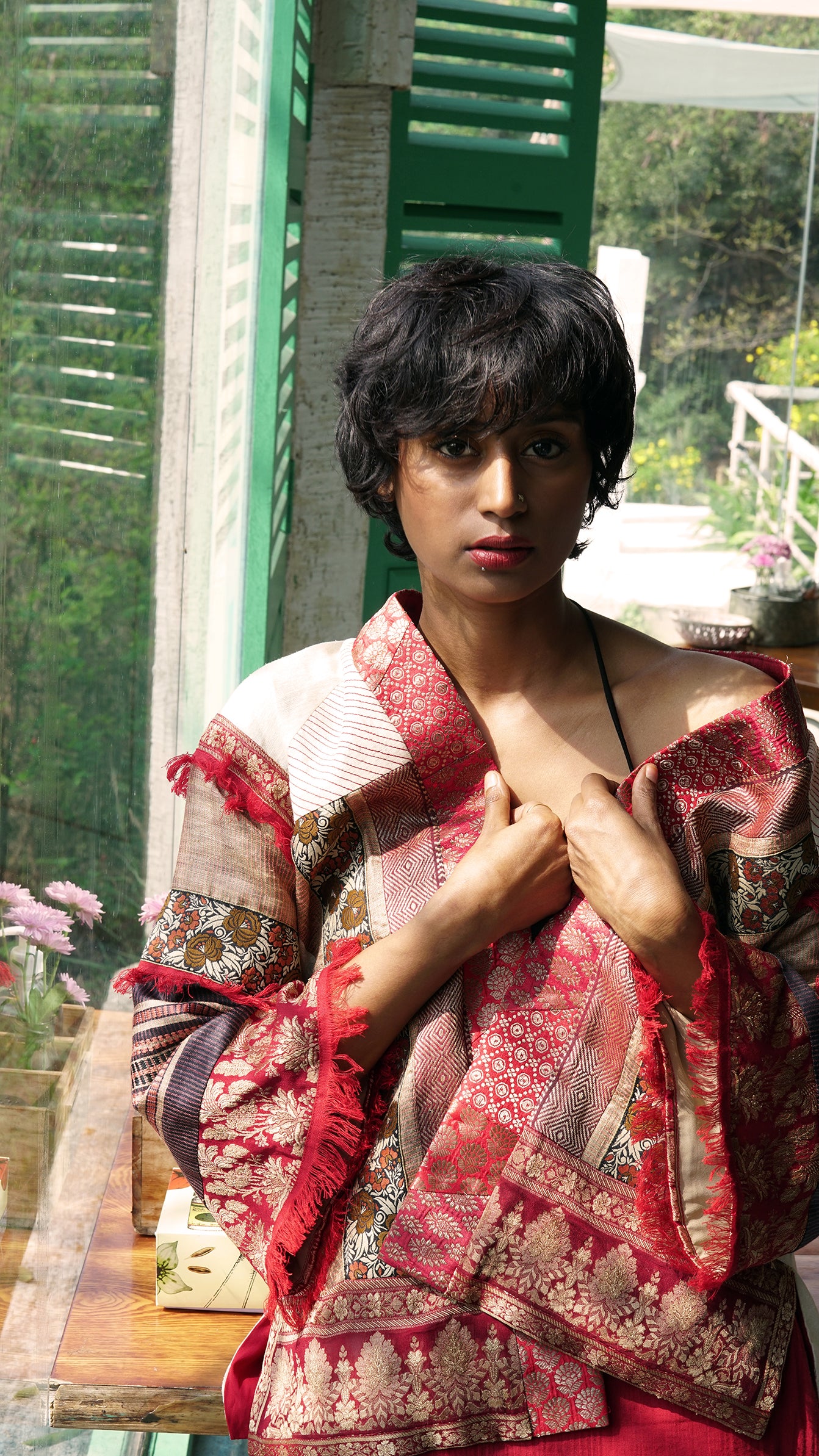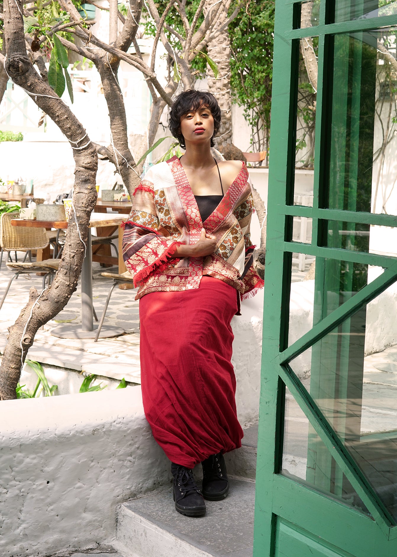 Off white and red brocade jacket with bell sleeves and fringe detail